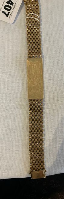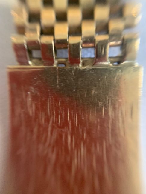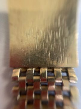 Some scratches to the panel: reverse possibly originally with bark textured finish (see additional photo). With signs of general wear. Brick links in fair/ good condition: not too stretched. Length of bracelet 23.5cm approx. Clasp works well. Width of strap 1.8cm. Plaque 2.0 cm x 5.1 cm.