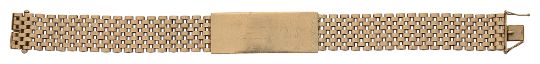 the rectangular panel lightly engraved with owners name, the articulated bracelet with push link marked 375 with makers initials C&F,