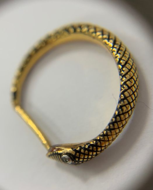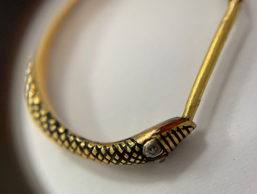 the snake's head with rose-cut diamond collet-eyes to the tapering body with finely cross-hatched black enamel decoration