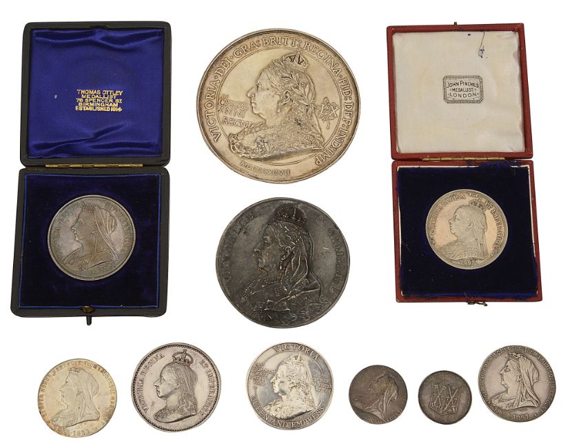 first by Bowcher issued by Spink, second veiled crowned bust right rev. figure of Victory with holding a laurel wreath and a shield with the Royal Arms, Windsor Castle behind, together other commemoratives: cased Southport medal by Ottley, a cased medal by John Pinches,