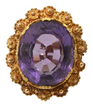 An amethyst ring, collet-set to the ornate cannetille and flowerhead surround2.2cm x 1.9cm, ring size P, 6.7gCondition: Minor damage to cannetille to rhs side of shank (see image) Possibly later shank. . Evidence of shank enlargement