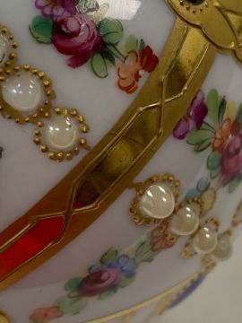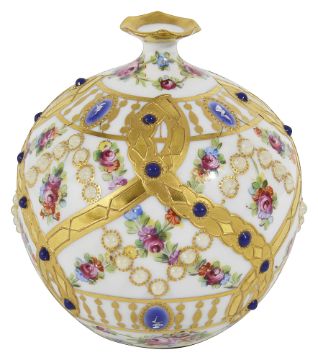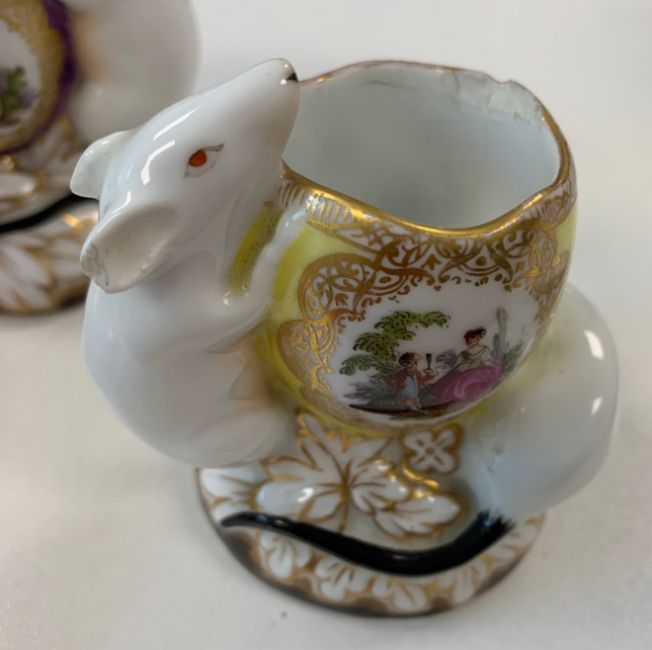 A Vienna porcelain vase,early 20th century, of squat globular form, with jewelled decoration, decorated with floral swags and gilt border, together with a pair of Helena Wolfsohn style mall vases, in the form of mice surrounding pot, with Augustus Rex mark to base, and a lidded powder box, decoration with sailing motif (4)the first height 11.5cmCondition: The first - apparent evidence of restored crack to bodyThe pair - yellow mouse restored chip to ear, fleabite chips to ears in general restored chip to rim of bowl, vertical crack running from chip, flake chip to lower edge. Purple mouse - fleabite chips to ears, flake chip to base.Box - wear and staining throughout.