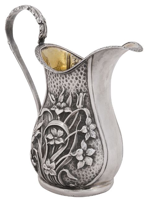 of plain baluster form, acanthus leaf scroll handle and tooled border, decorated with shaped repousse panels, against a plannished field, interior gilt