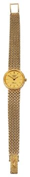 with gold circular dial with baton numerals, the bezel with woven effect, woven gold bracelet marked 375