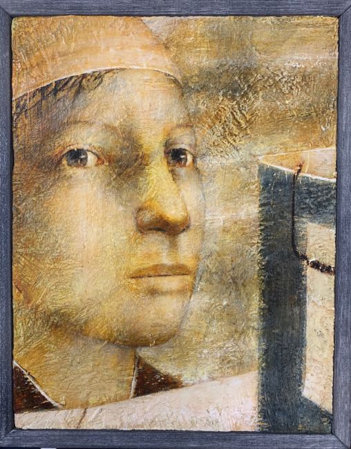 'Head', 1996, oil on cotton, overlaid on board, inscribed and labelled verso, framed,