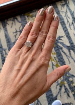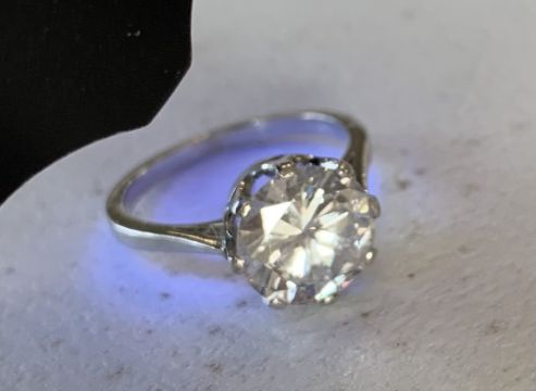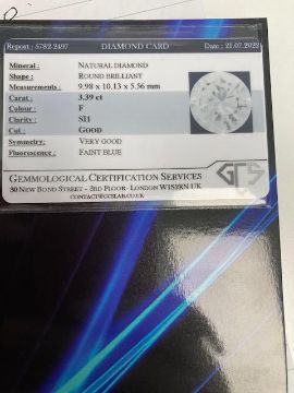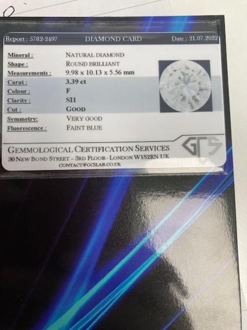 Offered with a diamond report from GCS, numbered 5782-2497, dated 21 July 2022, stating that the diamond is F colour, SI1 clarity, faint blue fluorescence