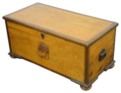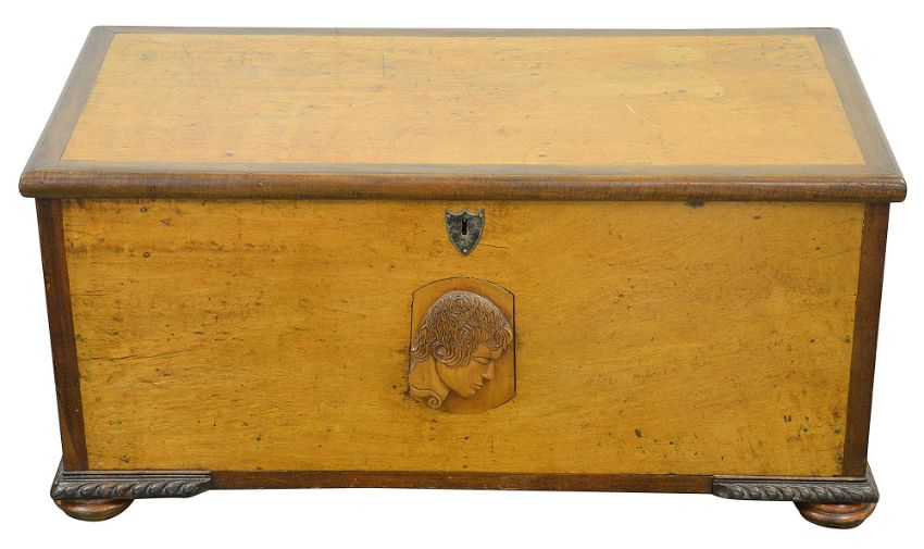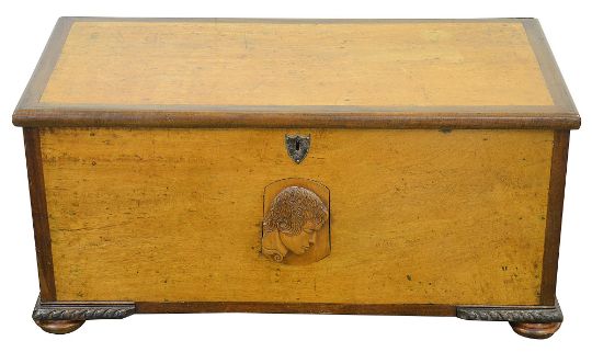 carrying handles to sides, the front inset with a later carved wood plaque portrait of a man in profile, white metal shield shaped escutcheon, gadroon carved basal corner moulding, on compressed feet