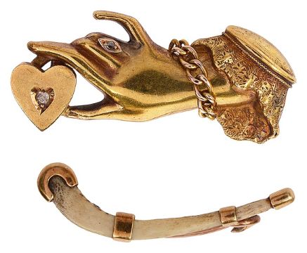 hallmarked Chester 1902, the outstretched hand hold a heart between index and thumb set with diamond to centre, the hand wearing a diamond set ring and bracelet with heart locket, together with an unusual gold mounted bone brooch in the form a hockey stick (?) with engraved date to reverse 16/03/03 (2)