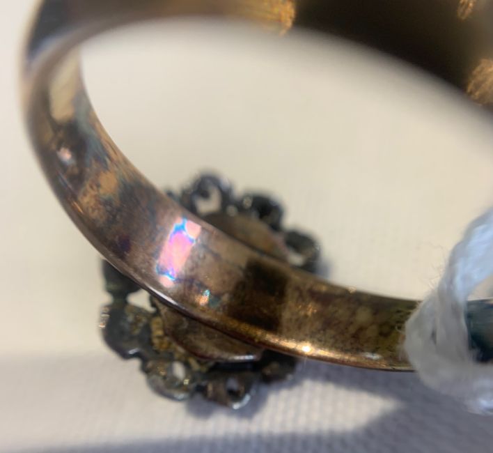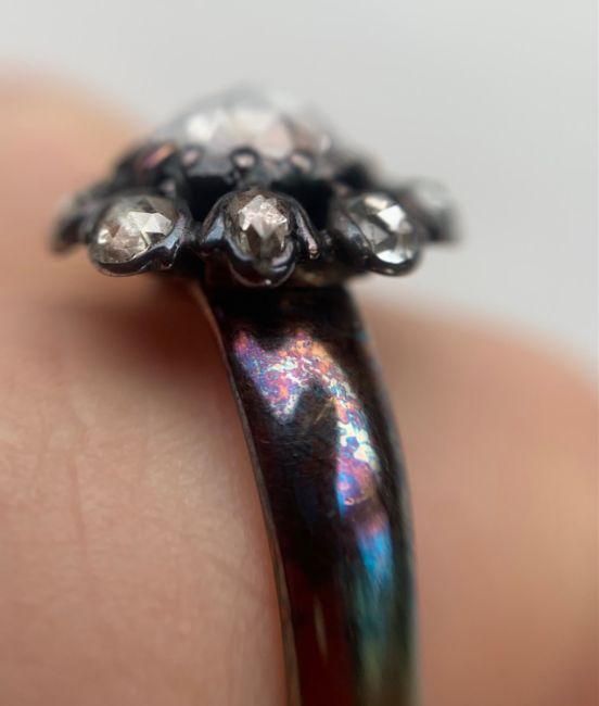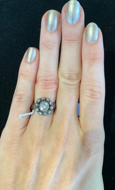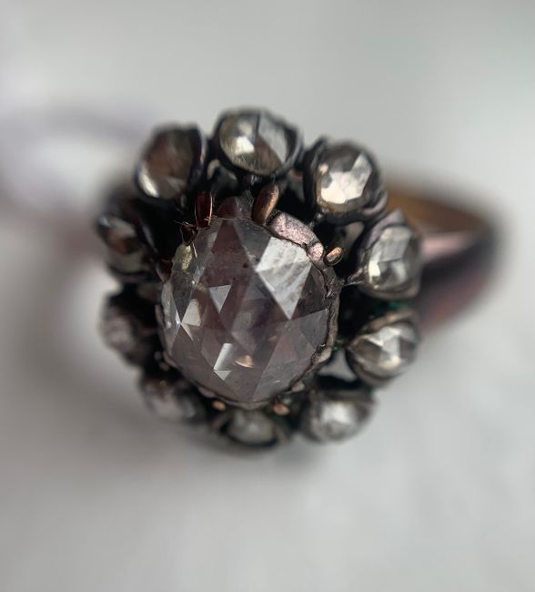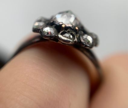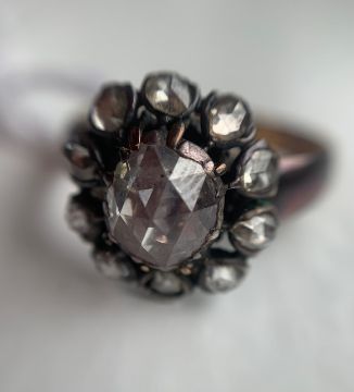Condition: Diamond cluster measurement 13.0mm x 12.4mm. Cluster good but probably applied to later band shank. Centre diamond greyish, out diamonds brownish. Inclusions visible with the naked eye to central diamond.