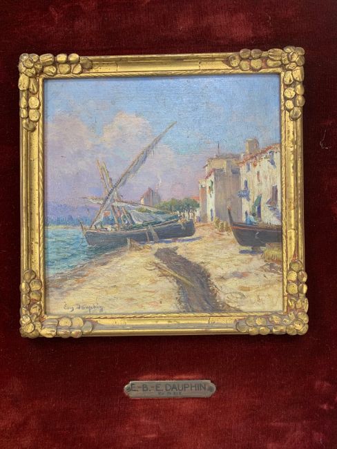 'Harbour Beach with Boats', oil on board, signed to lower left corner, framed with further velvet surround and frame, bearing plaque 'E.-B.-E. Dauphin, Ec Fr XIX',