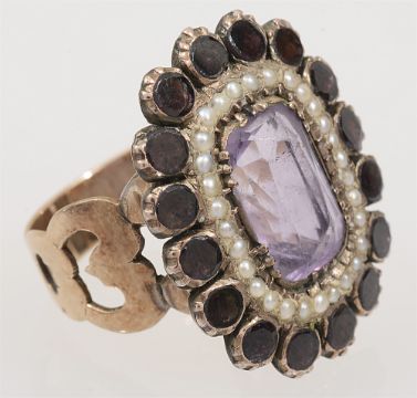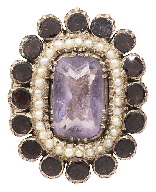 An amethyst, garnet and seed pearl cluster ring