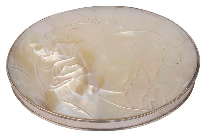 oval, stand away hinge, the top naively relief carved with a stag, the base mother of pearl