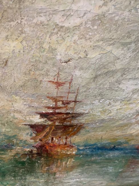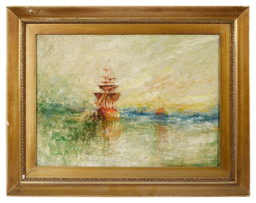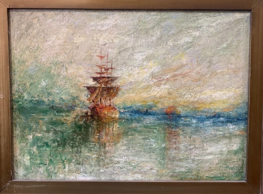 'Three Masted Ship at Sunset', oil on canvas, unsigned, framed,