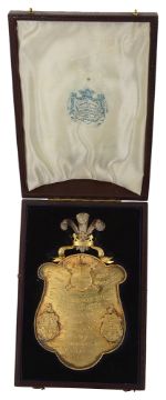 of shield design surmounted by The Prince of Wales Plumes, coronet and motto and bearing three further coats of arms of the Lord Mayor and Sheriffs, engraved Presented by the Right Honourable W. Annserson Rose Lord Mayor. J.C. Lawrence Esqr Ald. Hugh Jones Esqr Sherriff's 1862-3 to Thos Burrowes Esqr Member of the Committee, raised ropetwist border, in original fitted leather case