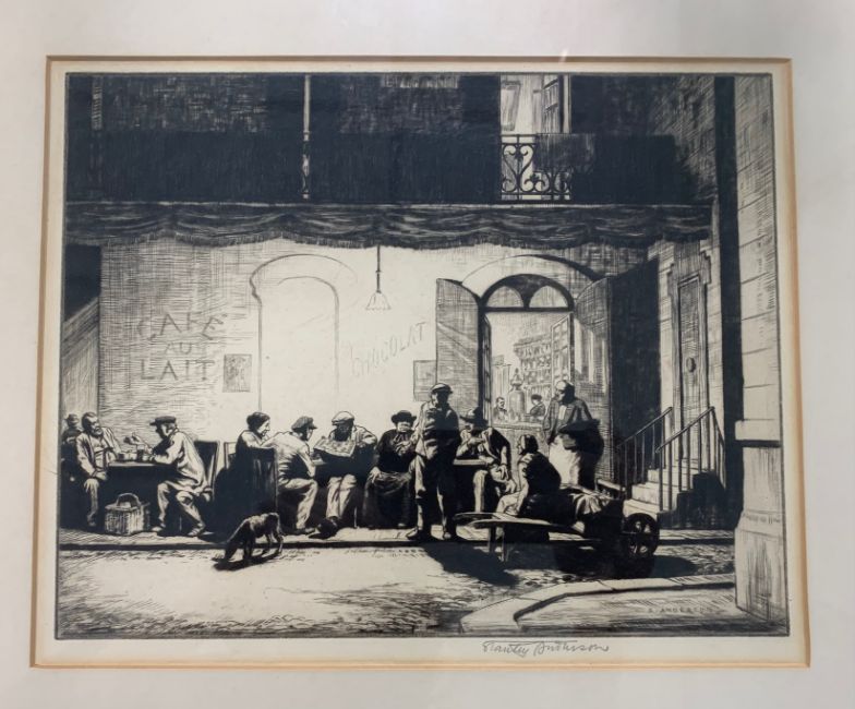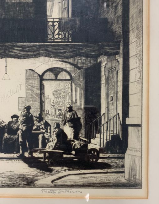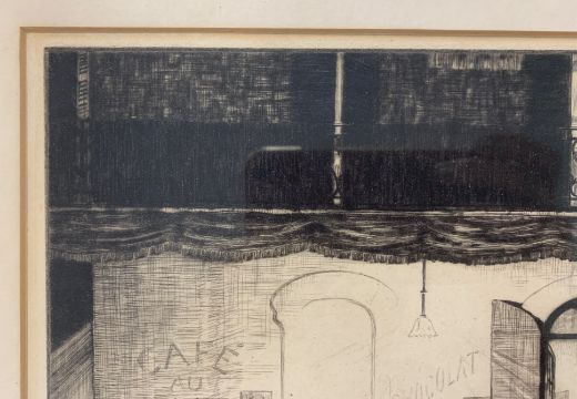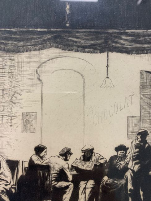 'Cafe de Papes', dry point etching, signed in pencil to lower margin, framed and mounted,