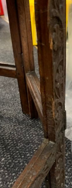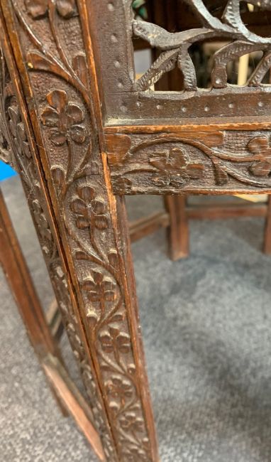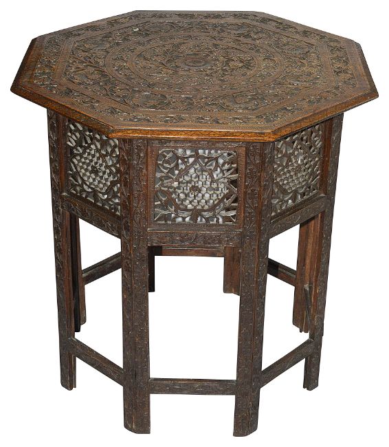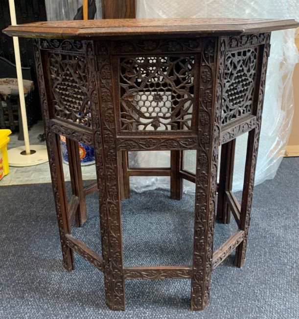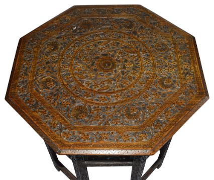 A carved Indian hardwood octagonal occasional tablelate 19th/ early 20th century, detachable top carved profusely with leaf motif round central flower, over carved pierced folding base, decorated with foliate motif,width 61.5cm, height 63cmCondition: Overall good condition - some slight damage to base. The tracery is all in good order with no losses.This lot  will be removed to our offsite storage facility if not collected at the sale venue – Farleigh Golf Club, Warlingham 3pm by Friday 16th Please contact us for more information.