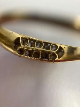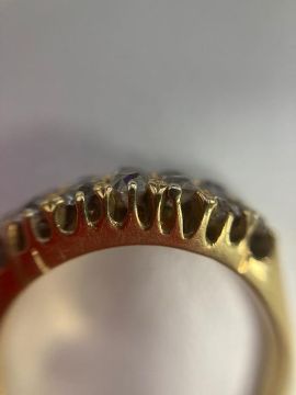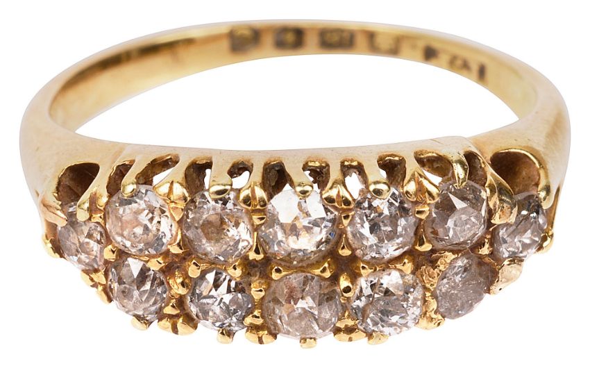 A late Victorian two row diamond-set ring, set with 12 old-cut diamonds to the 18ct yellow gold pierced gallery and plain shank, London hallmark, 1898size J, 3.8gCondition: Overall condition fair, commensurate with ageVariously cut old diamonds.  Bright stones with reasonable clarity Base of shank thin though hallmark still good.