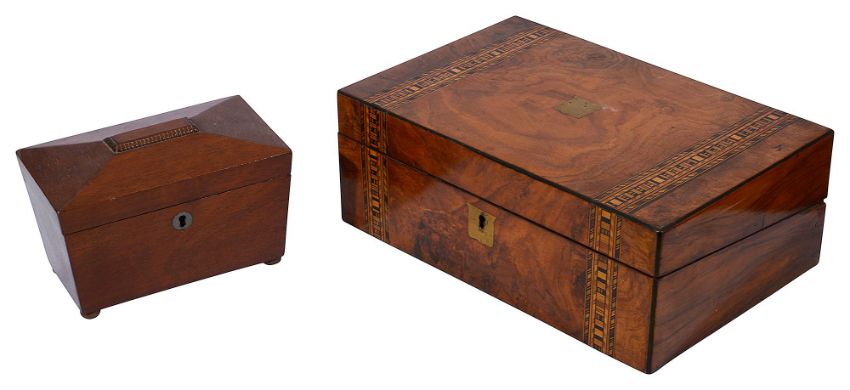 A Victorian figured walnut and parquetry banded writing slope and a Regency mahogany sarcophagus shaped tea caddy