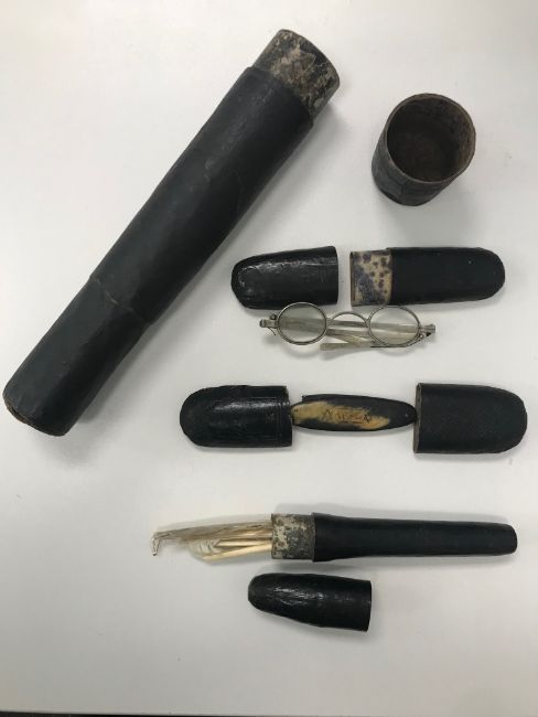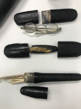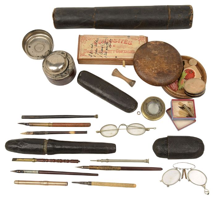 Condition: Mostly in condition commensurate with age. light rubbing to gold plating on propelling dip pen, some teeth on horn comb broken, Additonal pair of spectacles, not those with folding arms, has a broken arm. Chip to leather on inkwell, and marks to plated, card quill case with crack to bootom running round edge