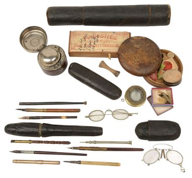 to include a Victorian gold plated propelling dip pen engraved Wm Lees, Manchester from J.R Beard, 1873, a foliate silver and mother of pearl grip, various other tip pens with turned wood, bone and porcupine quill grips, a pair of early 19th silver plated spectacles with folding arms in an embossed leather case, pince nez, a tooled leather and card quill cases , a horn folding comb in leather case, an early 19th century card box and contents bearing green label 'London portable Nib Pens, Warranted made with Knife', a leather case travelling inkwell, a pot containing wax seals, etc., (qty)