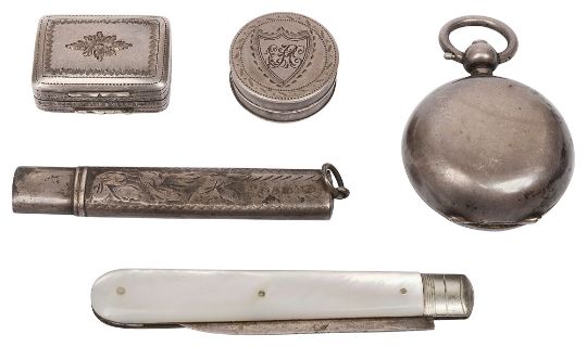 first Birmingham, 1820 by Thomas & William Simpson, rectangular cushion form, chased foliate decoration, gilt interior with hinged pierced grille, second, unmarked, circular, bearing a shield shaped reserve and initials, together with foliate chased chatelaine pencil and a Victorian mother pearl handled folding fruit knife, (5)