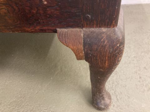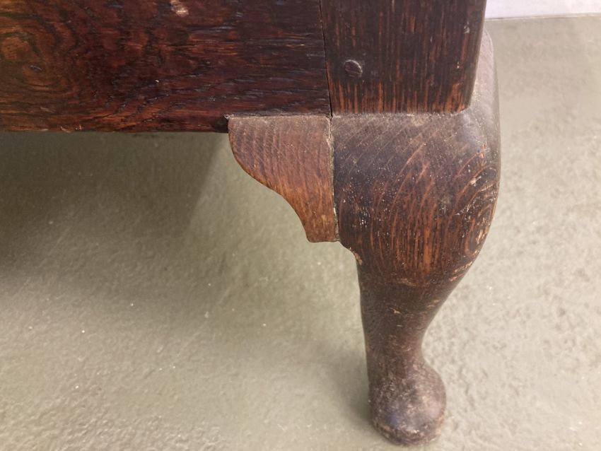 Condition: Frame in good condition. Slight shrinkage to joints on panes. Light surface scuffs and wear. One block replaced to top right joint of leg front right. Old Repair with bracket to inside joint of centre leg. Seat in need of attention / recovering webbing