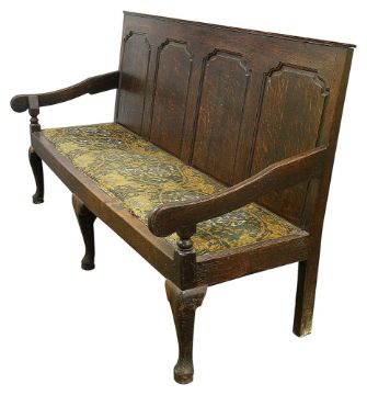 plain top rail over a four fielded panel back with ogee top corners, with downswept arms and upholstered seat, on three cabriole front legs with pad feet, plain rear legs