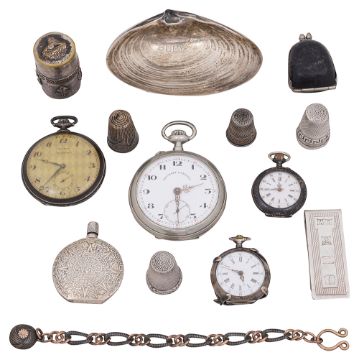 Condition: Niello fob watch does not wind. Cyma winds ticks and runs. Roskopf Patent watch winds ticks and runs. Plated thimble case is rubbed. Other silver pocket watch and smallest dictionary not photogrpahed.