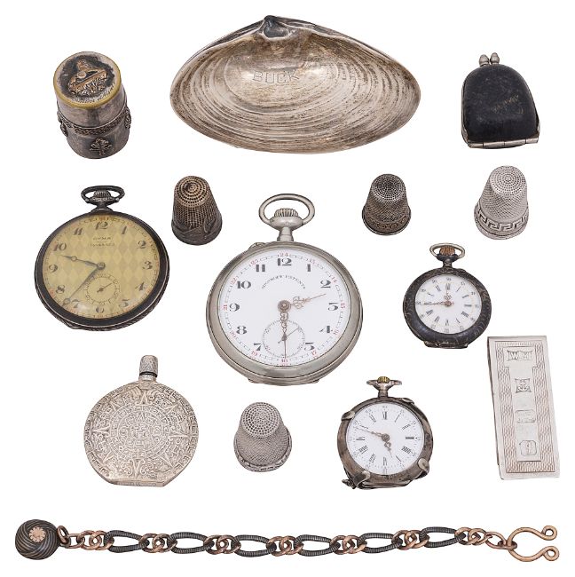 to include a Swiss lady's .800 silver and niello fob watch attached a silvergilt and niello flat curblink watch chain stamped 800, another silver lady's fob watch with sprung wrist cradle, a .900 silver cased Cyam open faced top wind pocket watch signed Cyma Tavannes, a Roskopf Patent open face top wind pocket watch, another silver cased pocket watch,silver items to include an American sterling silver shell pin dish engraved 'Buck', a Mexican scent bottle, an engine turned money clip and four continental thimbles, a plated Alsace souvenir thimble case, and a metal cased Smallest French & English Dictionary' etc., (qty)
