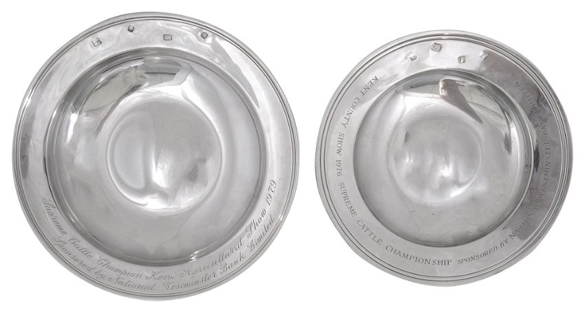 first London, 1978 by John Henry Odell, typical plain design with feature hallmarks bearing inscription 'Supreme Cattle Champion Kent Agricultural Show 1979 Sponsored by National Westminster Bank limited, Second, London, 1973 by William Comyns & Sons Ltd, similarly engraved, (2)
