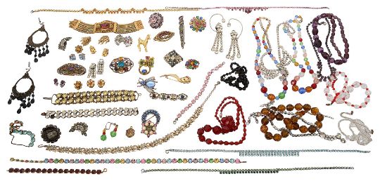 to include an early 20th century red paste stone set gilt metal bracelet with wide articulated mesh link strap and foliate chased clasp, Trifari mask brooch, a pair Lawrence Vbra crystal cluster earclips, a double row yellow stone set gilt metal chain link bracelet, various Czech crystal brooches, assorted graduated crystal bead necklaces, assorted diamante necklaces and earclips, etc., (qty)