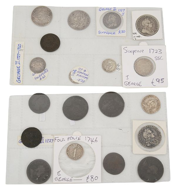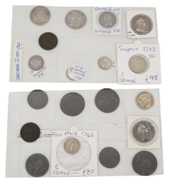 to include George I: shilling 1723 x2, sixpence 1723, halfpeny 1723 and farthing 1721, George II: shilling, 1745 LIMA, sixpence, 1757 + 1746, Maundy fourpence 1739 (drilled), + 1746, Maundy threepnece 1740 + 1760 etc. (qty)