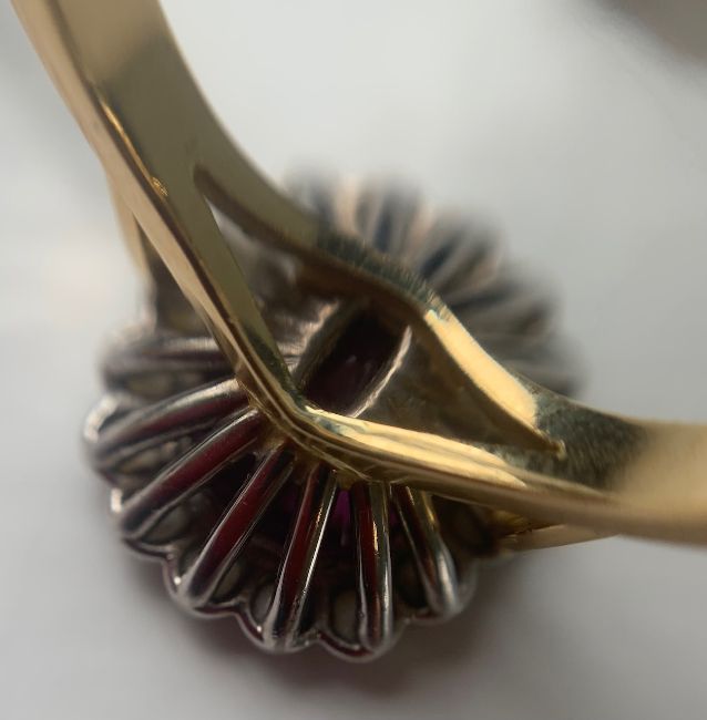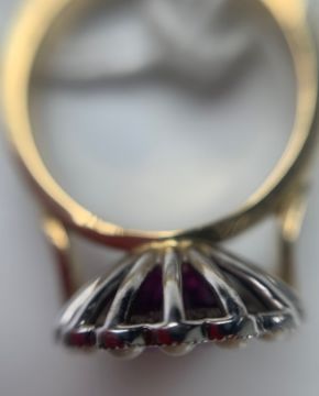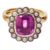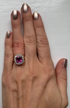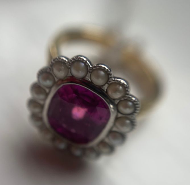 Overall condition good/very good - one pearl with exfoliation. Pink sapphire bright with good saturation and slight blue undertones. 8.5mm x 7.7mm x 4.2mm approx (as inaccessable - no inclusions visible as inaccessable).