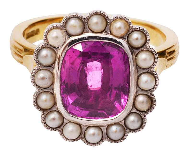 the cushion-shaped pink sapphire collet-set to the border of half pearls, with navette shoulders and ridged tapering shank, 18ct yellow and white gold setting, Birmingham hallmark