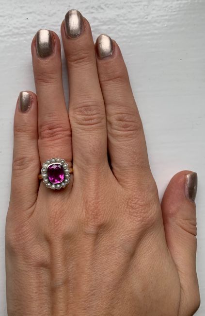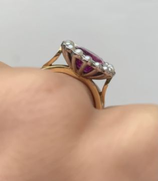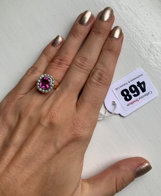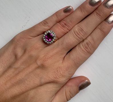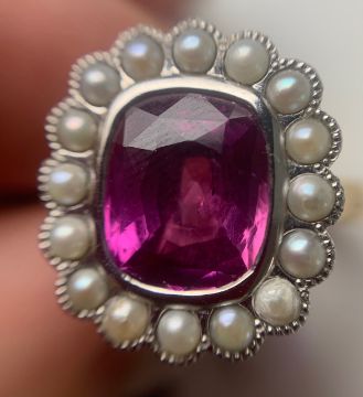 A pink sapphire and pearl cluster ring,