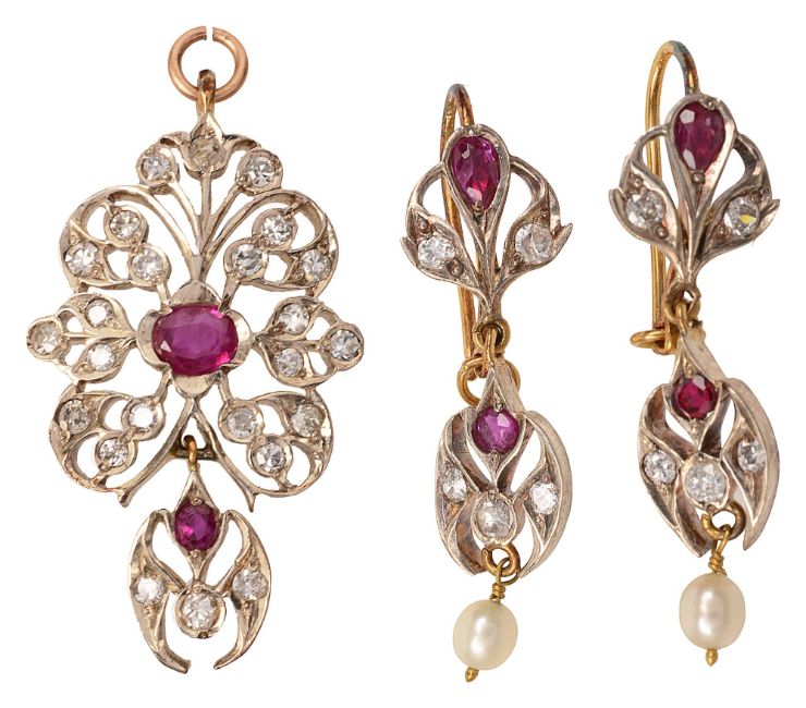 each set with mixed-cut rubies and old-cut and single-cut diamonds and mounted in silver and yellow gold, the ear pendants each suspending a seed pearl (untested)