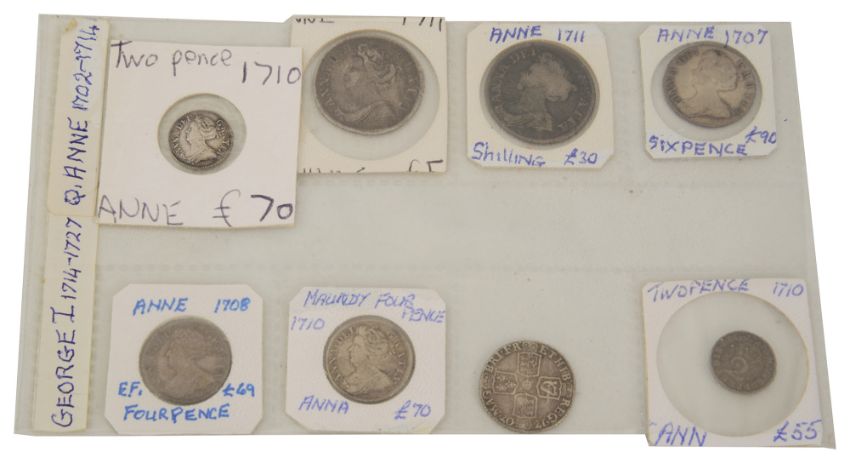 comprising Queen Anne: Shilling, 1711, x2, sixpence, 1707 x2, Maundy fourpence 1708 + 1710 and Maundy Twopence 1710 x2, (8)