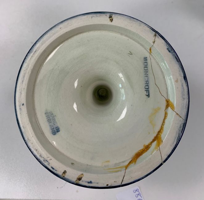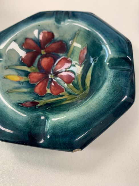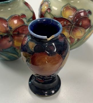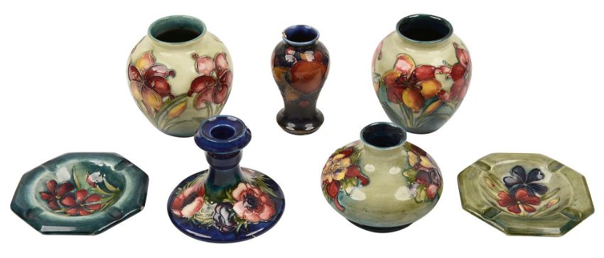 A collection of seven pieces of Moorcroftincluding: two 'African Lily' pattern vases, design slightly differing each decorated against a blue green ground; a miniature 'Pomegranate' pattern baluster vase; two 'Spring Flowers' patterned ashtrays, one decorated against blue green ground, the other a green ground; a 'Poppy' pattern candlestick and a 'Columbine' pattern vase, all bearing impressed makers marks (7)the first height 10.75cmCondition: African Lily vases - generally good orderPomegranate - Broken and piece missing Ashtrays - blue green ground chipped, the other generally good orderCandlestick - Broken cracked and gluedColumbine vase - generally good order.