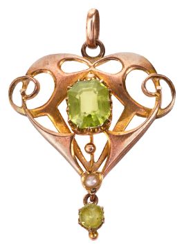 An Edwardian 9ct peridot and seed pearl pendant