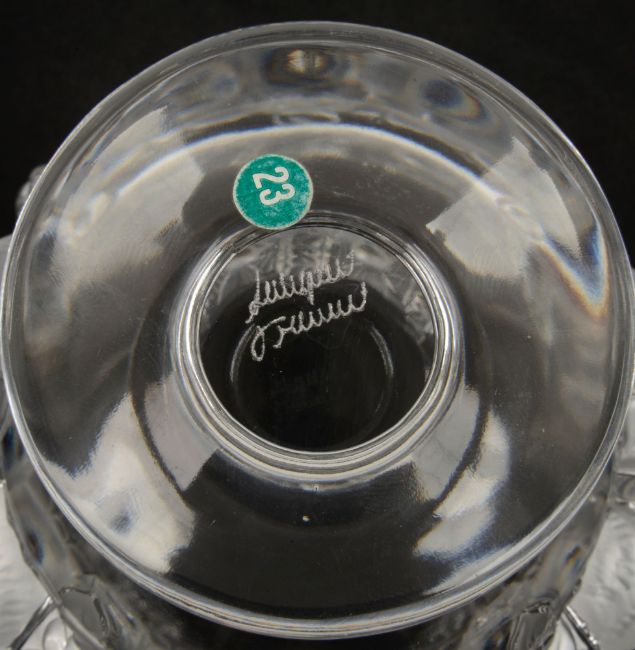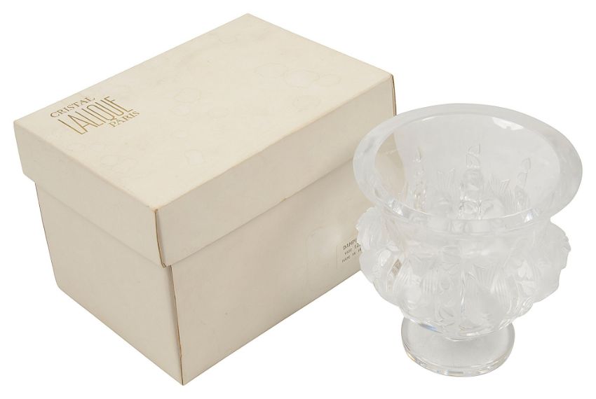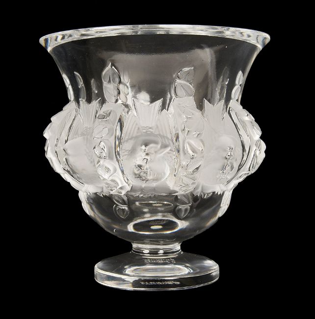 c. 1960s, designed by Marc Lalique 1948, of campana shape modelled with repeating bird and leaf motif, marked to base 'Lalique, France' and with numbered sticker '23, in original 'Lalique, Cristal, Paris' box,
