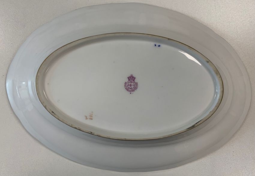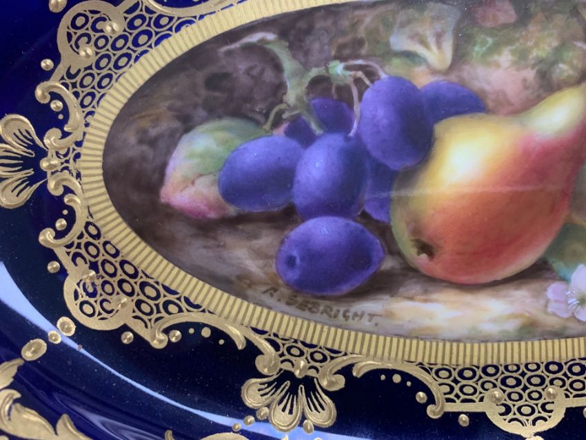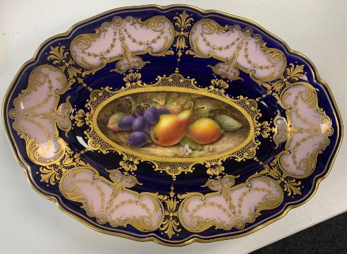 central panel painted with pears and grapes, signed to lower left, on Royal blue ground, blush pink cartouche panel border decorated with gilt, printed puce mark, date code 1918, numbered W8868,