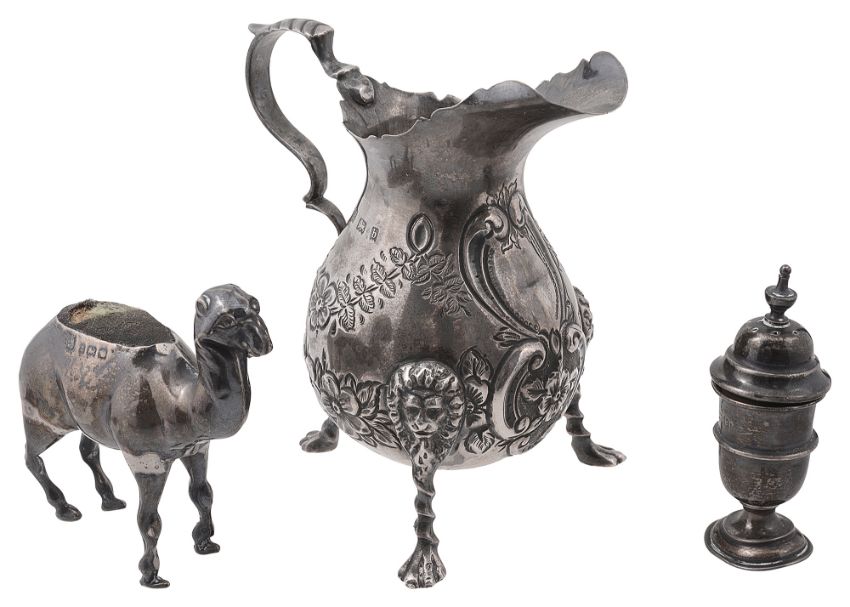 A late Victorian silver novelty camel pin cushion, a cream jug and a pepper pot