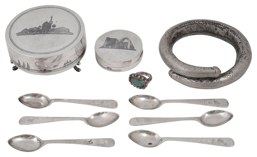 first, signed, circular with pull off lid decorated with river landscape views with palm tress, camels and buildings together with a similarly decorated circular powder compact, a set of six Iraqi coffee spoons with engraved handles, a Bedouin snake armlet and a turquoise ring (qty)