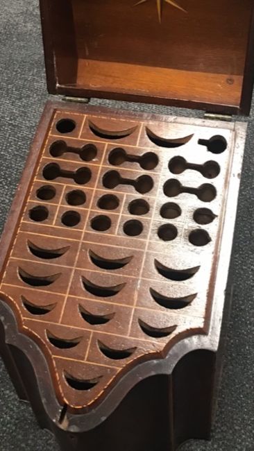Condition:The lid with a section of stringing missing to its left. Base warped and there are some losses to the edges of the base. Rear top edge lacking stringing. Rear of lid with split top to bottom.