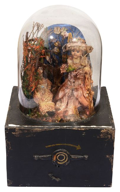A scratch-built automaton diorama of two Victorian girls in a garden
