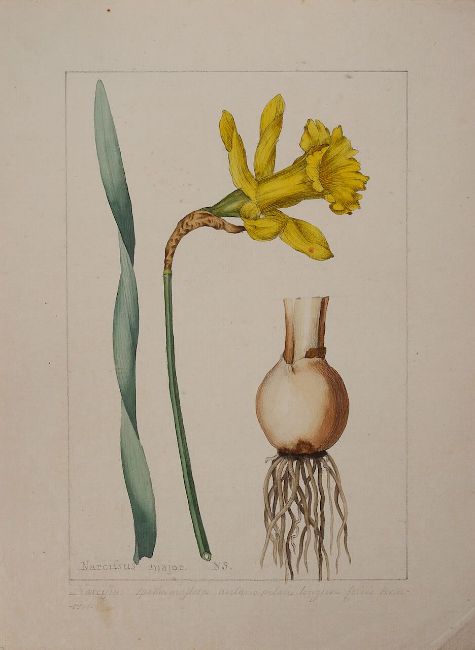 'Narcissus Major NS' bearing inscription to lower margin 'Narcissus Spatha uni flora nectario pelalis longiore folus torlu - osis', watercolour and pencil