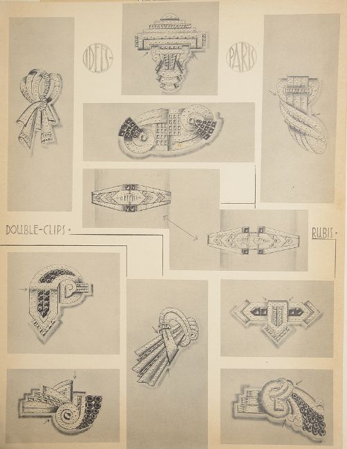 1930s, twenty eight examples not mounted, with designs for rings, bracelets earrings, necklaces, most bearing logo, 'IDEES Paris', five with sections cut out, together with four mounted colour examples, and a booklet entitled, 'ECRIN de Tres Beaux et Importants BIJOUX', dated '16 Novembre 1933', enclosing seven prints, (40)