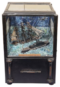 A cased scratch built automaton diorama of ships and planes