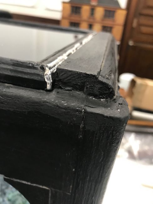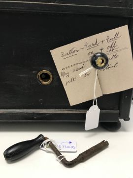 Condition:Two replaced mouldings to either side of the top glazed panel. One loose splinter of wood inside the case. The knob handle when pushed in makes the planes spin and also rocks the boats. The winding handle needs ten turns.