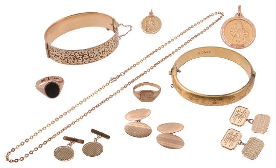 all stamped .375, 9ct, to include two pairs of oval cufflinks, one rectangular pair, a pendant a St Christopher, one ring inset the other monogrammed, together with a 9ct gold strapwork bangle, a rolled gold bangle and a gold plate St. Christopher pendant, (10)